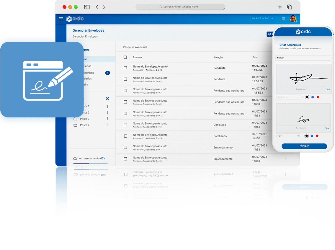 Plataforma leve e intuitiva para assinatura de qualquer tipo de documento, como: contratos de prestação de serviço, aluguel de imóveis e veículos, contratação de funcionário e tudo mais que sua empresa precisar oficializiar.